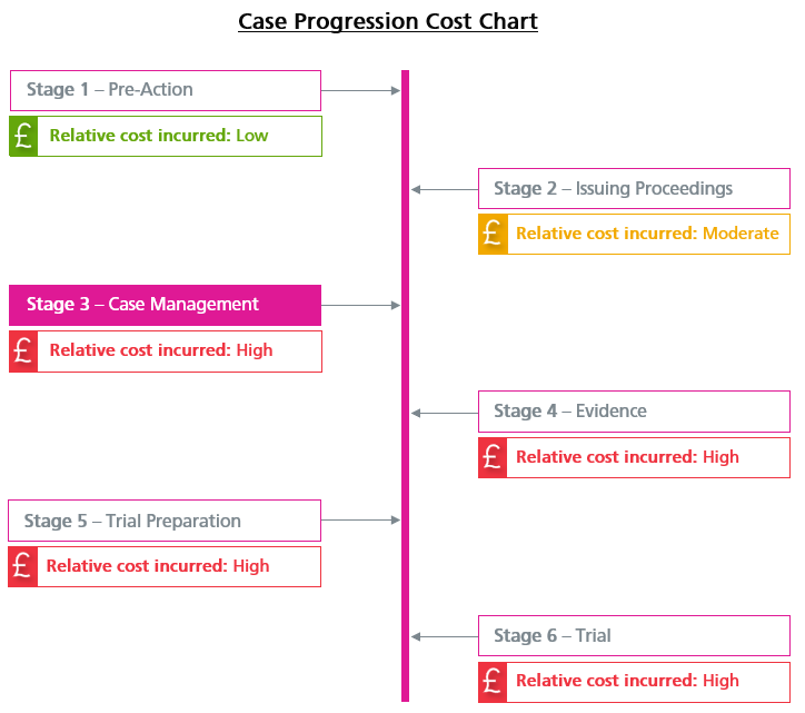 After serving the claim form and exchanging statements of case, the CCMC emerges as an important checkpoint for many cases on the multi-track before setting sail for trial. This is because that is when the Court sets the future timetable for the case, shaping its ultimate trajectory. The infographic below illustrates the relative costs incurred at each stage of case progression, showing that the Case Management stage not only carries a high cost in itself but also marks the beginning of subsequent resource-intensive phases.