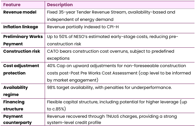 Under the CATO model, a competitively selected entity would be licensed to design, finance, construct, own and operate defined onshore transmission assets, receiving a long‑term, availability‑based, inflation‑linked revenue stream. While assets remain part of the national transmission system and subject to regulatory oversight, delivery responsibility shifts away from the incumbent transmission owners.
